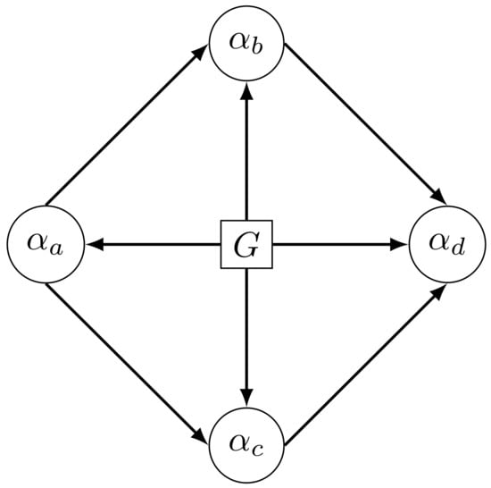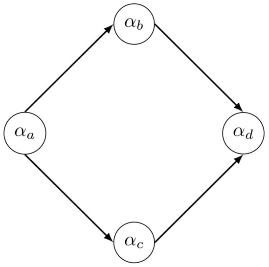 This decomposition follows directly from the product rule of probability []. Mathematically, any product decomposition of is valid; hence, for instance, the product could have been used instead of the decomposition in Equation (4). However, the former is a more useful representation as it matches the diamond structure in Figure 1 whereas the latter implies a slightly different diamond structure. Using terminology from the BN literature, is called a parent of and (alternatively, the latter are also called children of ), and are parents of , and is an ancestor of (alternatively, is a descendant of ).