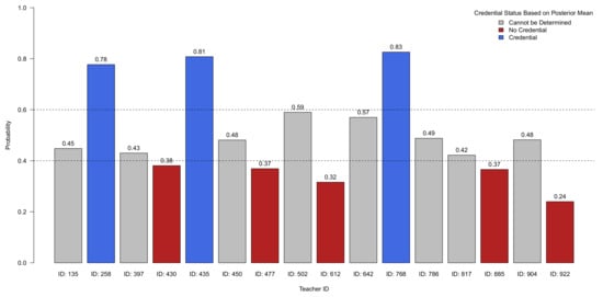The main objective of this analysis was to investigate the invariance parameters; however, the Bayesian framework can also be used to make inferences about other quantities that may be of interest to researchers. With respect to the DTMR dataset, there were several teachers for which credential status information was not available (). Rather than removing these cases from the analysis, we treated credential status for these cases as Bernoulli random variables. In doing so, the Gibbs sampling algorithm will construct a credential status posterior distribution by drawing a value from its full conditional distribution at each iteration of the Markov chain. The mean of the resulting posterior distribution quantifies the probability that a given teacher possesses their credential given their responses on the assessment.