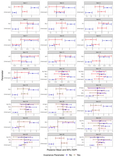 Invariance analyses in the Bayesian framework differ slightly from traditional approaches based on the frequentist framework. A key difference between the two approaches is that the latter tests for ‘strict’ invariance whereas the former tests for approximate invariance (e.g., [,]). Briefly, ‘strict’ invariance procedures test whether invariance parameters are exactly zero in the population and inferences are based on asymptotic arguments. By contrast, the approximate invariance approach allows the invariance parameter to live in a neighborhood around zero and the associated effect can still be considered invariant. This assumption is more realistic as parameters across groups are rarely ever exactly equivalent. We refer the reader to [] for more information on the approximate invariance approach.