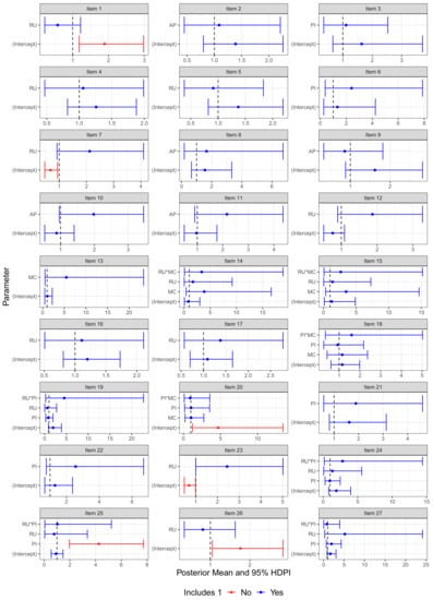 For each invariance parameter, we also constructed a measure of effect size by computing the odds ratio. More specifically, can be shown to be the odds ratio of item endorsement for the focal group relative to the reference group. The value implies that the odds of item endorsement for credentialed teachers is times that of non-credentialed teachers. Thus, this value can be interpreted as a measure of effect size, with a value of 1 indicating that the odds between the two groups are equal, a value greater than 1 favoring the credentialed group, and a value less than 1 favoring the reference group. For each iteration of the Markov chain, was computed after was sampled from its respective distribution in the Gibbs sampling algorithm. The resulting distribution approximates the posterior distribution of the odds ratio, which can then be used to construct a HDPI. The effect size of the invariance parameter is said to favor one group over the other if the 95% HDPI of does not contain 1.