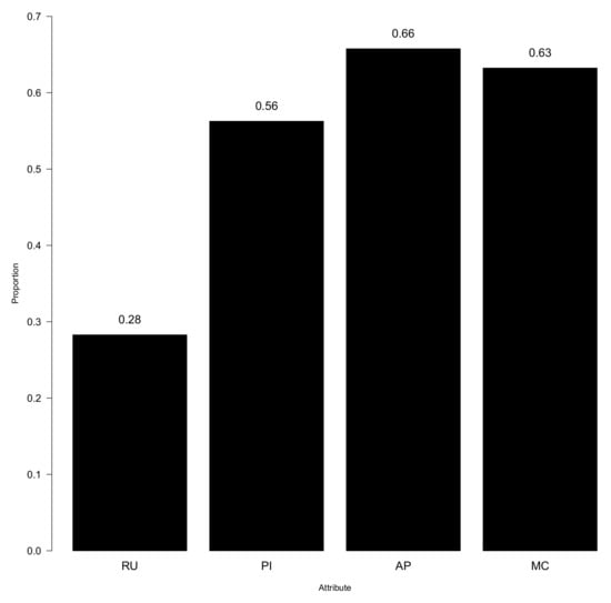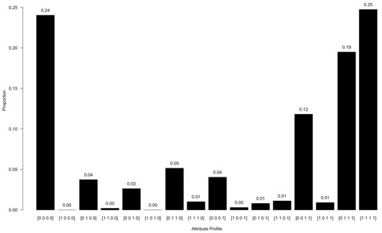 Two key features that characterize DCMs include the Q-matrix and the attribute profile. The Q-matrix is a loading structure that links the latent attributes to the manifest variables []. Suppose that there are I manifest variables (i.e., items) and A latent variables (with ). The Q-matrix is an indicator matrix where entry if item i is hypothesized to measure (or provides information about) attribute a and otherwise. Each row of the Q-matrix describes the set of attributes that load onto item i. Construction of the Q-matrix is generally informed by theory or by domain experts (e.g., []). In this paper, we assumed that the entries in the Q-matrix are known; however, see, for instance, Refs. [,,,] for data-driven approaches for learning the structure of the Q-matrix.