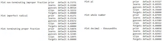 The Model function fits the BKT model to all skills available in the Cognitive Tutor dataset. However, we can also train the model for a single skill or a set of skills. In the Cognitive Tutor dataset, there are 12 math skills, indicated as KC(default (i.e., knowledge components). Assume that a teacher is interested in understanding students’ mastery of generating plots for various purposes, which encompasses knowledge components such as plot terminating improper fraction, plot non-terminating improper fraction, plot whole number, plot decimal - thousandths, and plot pi. We can use regex to simply match the knowledge components that include the word plot for selecting the skills that we want to use for training BKT. We use skills = “.*Plot.*” to select plot-related knowledge components and fit a standard BKT model, without considering other model specifications such as forgets, multigs, multiprior, multipair, multilearn. In Listing 3, we initialize a BKT model and fit the model for skills including Plot.