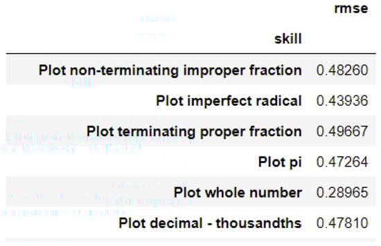 After running a three-fold model cross-validation, we obtain the RMSE values of 0.48, 0.44, 0.50, 0.47, 0.29, and 0.48 for plot non-terminating improper fraction, plot imperfect radical, plot terminating improper fraction, plot pi, plot whole number, and plot decimal- thousandths, respectively (see Figure 3).