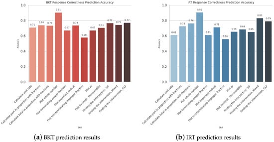 The results indicated that both models exhibited a promising performance in predicting the correctness of learners’ responses, with each model estimating the results separately for each knowledge component (see Figure 4). Comparing the average classification performance of the BKT and 1PL IRT models, we found that the BKT model achieved a slightly higher average performance of 0.73, while the 1PL IRT model achieved an average performance of 0.71. Notably, both models demonstrated their strengths and weaknesses across different knowledge components. The “Plot non-terminating improper fraction” category emerged as the worst performing component, while the “Plot whole number” component exhibited the highest accuracy, with both models achieving close to 90% accuracy. These findings emphasize the potential of both the IRT and BKT models in effectively modeling learners’ responses and providing valuable insights into knowledge component performance in educational settings.