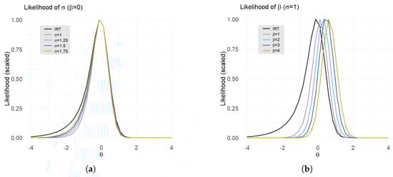 Impact of model for on student likelihood, evaluated at fixed quadrature points [−4,4]. (a) Student likelihood at different values of , holding fixed at 0. (b) Student likelihood at different values of , holding fixed at 1.