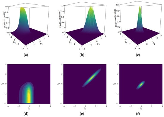 3D and 2D density plots of the components of a student’s likelihood, evaluated over a grid of fixed quadrature points over (x-axis) and (y-axis). (a) 3D plot of item response likelihood. (b) 3D plot of latent trait. (c) 3D plot of complete distribution. (d) Contour plot of item response likelihood. (e) Contour plot of latent trait. (f) Contour plot of complete distribution.