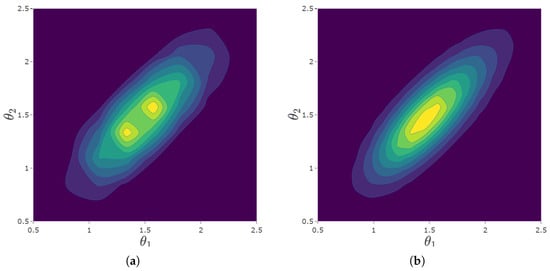Bivariate density plots for Algebra and Geometry subscales for a select student, evaluated over a grid of fixed quadrature points over (x-axis) and (y-axis). (a) Density evaluated over the standard grid. (b) Density evaluated over the spline interpolated grid.