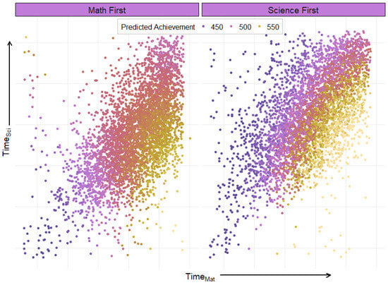 To aid the reader in understanding the net result of these interactions, Figure 5 shows predicted score as a function of time spent on math vs. time spent on science for students who saw math vs. science items first. Results are color-coded by predicted math achievement to demonstrate the association between time spent on the test and modeled score.