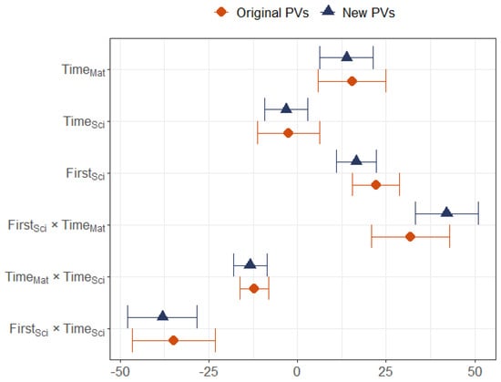 Plot of regression coefficients (excluding the intercept) for the model shown in Table 3, including 95% confidence intervals for the original plausible values (top, orange) and the plausible values that were generated after fitting our new conditioning model (bottom, blue).