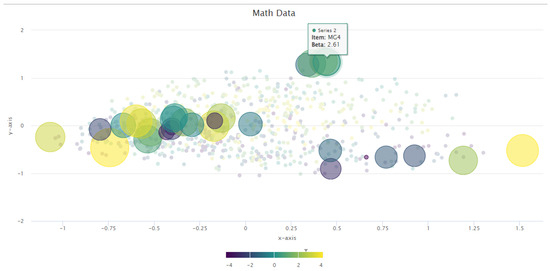 In general, this bubble chart interaction map answers questions important to educators without requiring them to delve into complicated statistics. First, they may wonder “Which items are generally easier/harder?” or “Which students are overall struggling and need more support?” These are common questions that they may ask. The bubble chart colors the respondents based on their levels of , allowing educators to quickly identify such students. Similarly, the items are sized and colored by their easiness parameters. Note that this information is not readily available from the original interaction map presented by Jeon et al. [4]. Second, educators who want an in-depth analysis may ask, “Which items are certain students struggling with?” Again, the distances from respondents to items are apparent, allowing educators to see not only which students are struggling but also which items. An educator can zoom into a darker dot in the lower left-hand corner of the map to learn not only that particular student is struggling but also that they are having trouble with items in the top-right quadrant of the map.