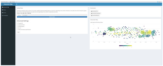 To fill this gap, we have developed IntMap, an application based on the shiny package [17] in R. This free-of-charge, web-based program is based on a user-friendly point-and-click system. The IntMap ShinyApp produces two types of visualizations, the interaction map and individual profiles, based on the input assessment data. The user interface uses the shinydashboard package [18] to create visually appealing dashboards within a Shiny application. In the application, multiple tabs allow users to upload their data, modify run settings (such as the burn-in period), display the interaction map, and download student profiles and estimated parameters. More advanced users can view convergence plots of the various estimated parameters. There are generally no limits to the size of data that can be uploaded to use this application. Practitioners can feel free to upload small-scale or large-scale assessment data (although computational times may be longer, especially if users choose a longer burn-in period or more iterations). The IntMap ShinyApp can be found at https://ohrice.shinyapps.io/LatentSpace/ (accessed on 19 October 2023), a picture of which can be seen in Figure 2.