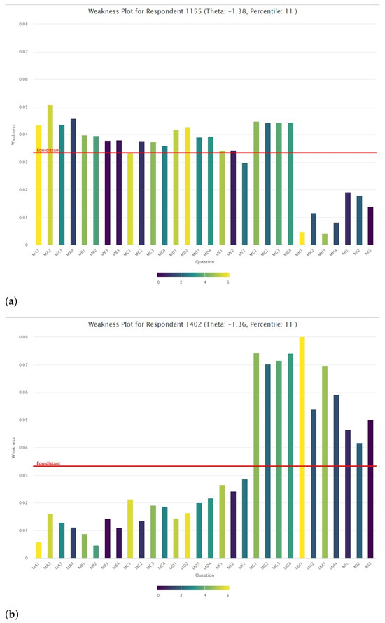 As an example, Figure 3 shows the profiles of two students. Although each student has roughly the same value of or overall ability, we can see from the profiles that they are weak in different items. Respondent 1155 has higher bars for all items except the “MH” and “MI” items, suggesting that this respondent needs more support on the domains of arithmetic and measurement. In contrast, respondent 1402 struggles with the “MH” and “MI” items, suggesting that they could use more support with geometry concepts. These profiles allow the educator to pinpoint specific areas that the students need more support with. Only looking at the by itself obscures these respondent-item interactions; therein lies the advantage of the map and profiles in revealing these important interactions.