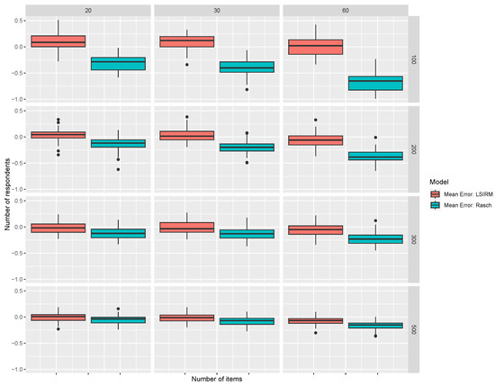 Distribution of mean errors across 50 replications. A mean error is calculated for each replication. Red indicates the results from the LSIRM and blue indicates the results from the Rasch models. The numbers on the top represent the number of items while the numbers on the right-hand side represent the number of respondents.