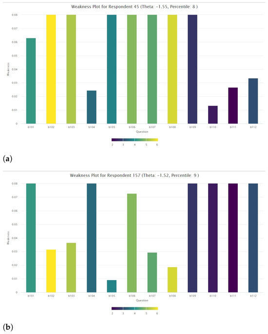 Finally, Figure 6 shows the profiles of two students, each with similar values of the person ability parameter. However, respondent 45 shows greater aptitude for answering items b104, b110, b111, and b112 correctly. This instructor may understand that this respondent does not have difficulty computing probabilities based on independent events but needs more support with other items. On the other hand, respondent 157 needs more support in understanding how to compute the probability of independent events. It is worth emphasizing again that because of these profiles, we can note these two respondents of similar abilities answer the same set of items (which have the same easiness parameters) with different correct response probabilities.