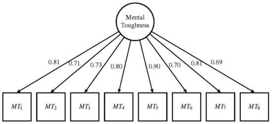 In more detail, the CFA model solutions were examined to ensure there was adequate model–data fit using Mplus (version 8.8; [50]). The grit instrument was modeled such that the passion and perseverance domains were separate, but the correlation between the two was freely estimated. The two-factor solution fit the data adequately well for this sample (CFI = 0.96, TLI = 0.93, RMSEA = 0.10, SRMR = 0.05) [51]. The reliability estimates for grit subdomains were 0.79 and 0.74 (ω). The grit model is shown in Figure 1. MT was modeled as a unidimensional construct, and the one-factor solution fit the data adequately well for this sample (CFI = 0.96, TLI = 0.94, RMSEA = 0.15, SRMR = 0.04). The factor scores were saved from these analyses and used in the subsequent analyses. The reliability estimate for MT was 0.92 (ω). The MT model is presented in Figure 2.