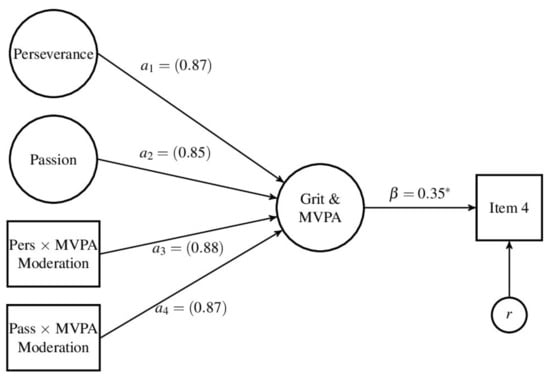The same set of analyses was conducted using Item 4 from the MTI as the outcome variable, and the general findings followed the same pattern but did not show the same strength. That is, there was a positive relationship between the grit and MVPA component and responses to Item 4 (β = 0.35, p < 0.001; Figure 4). The component also accounted for about 12% of the variability in responses to Item 4.