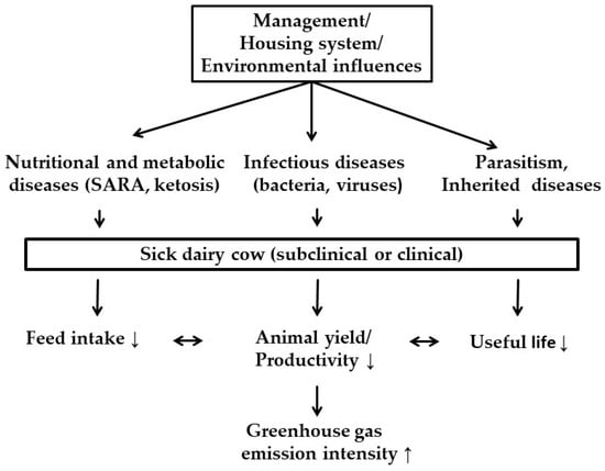 The objective of the present paper is to describe issues related to the first question. We wish to demonstrate the influence of animal diseases on the yields of lactating cows and on GHG emissions intensity (CO2eq per kg milk). Similar interactions were examined by the Global Research Alliance on Agricultural Greenhouse Gases [].