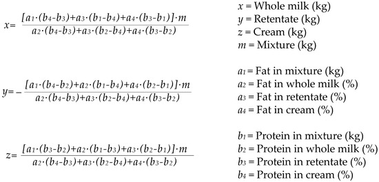 With this in mind, we developed a fresh goat milk cheese made with different milk formulations obtained by mixing predetermined amounts of whole goat milk, skim goat milk concentrated by ultrafiltration (retentate) and goat milk cream (Figure S4). The ultrafiltration of the skim milk was carried out by using a pilot plant (Mete S.r.l., Membrane Technology, Varese, Italy) equipped with a spiral-wound membrane in polyethersulfone (PES) (cut-off: 20 kDa; nominal area: 5 m2; Celgard, Charlotte, NC, USA). The transmembrane pressure, process temperature and recirculation flow rate were 0.17 MPa, 25 °C and 2.6 m3/h, respectively. The pre-established volumetric concentration ratio (VCR) was set to four and corresponded to 13% protein content in the retentate. Three formulations with different fat to dry matter ratios (40%, 30% and 20%) were prepared. Proportionally, the protein content was increased to compensate for the lower fat content, and the same level of total solids in cheese was kept (about 22%). The characteristics of starting components and final products are reported in Table 4. The exact amount of the single components (whole milk, retentate and cream) used for the milk formulations was determined by applying a system of equations that takes into account the fat and protein concentration in the three mixtures and in the ingredients. From the resolution of this system of equations, the mathematical formulae shown in Figure 2 were obtained.