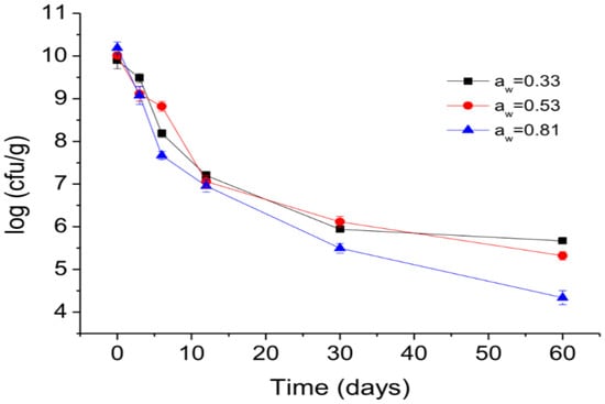 Survival of Salmonella enteric at 37 °C and 3 water activities during 2 months of storage in skim milk powder. Adapted from [].