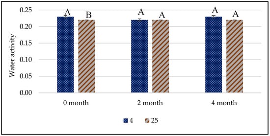 A,B Bars with different letters at 0 month are significantly different (p < 0.05). Comparison of water activity in powdered goat milk samples stored at 4 and 25 °C for 0, 2, and 4 months storage (adapted from []).