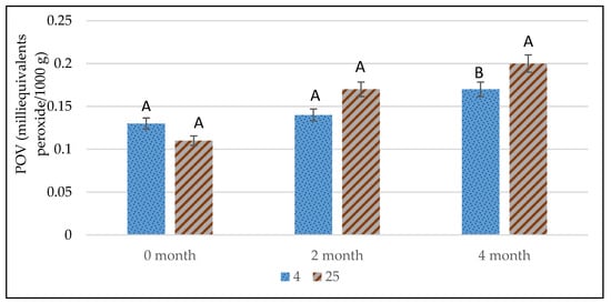 A,B Bars with different letters at 4 month are significantly different (p < 0.05). Comparison of peroxide values of experimental powder goat milk stored at 4 and 25 °C for 0, 2 and 4 months (adapted from []).