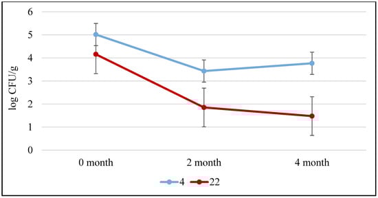 Comparison of the survival of Escherichia coli (log colony-forming units (CFU)/g) counts in powder whole goat milk stored for four months at 4 °C and 22 °C (adapted from []).