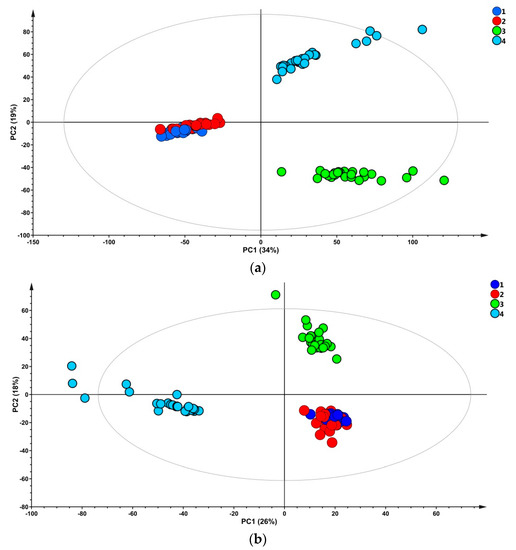 Principal component analysis (PCA) score plots of milk samples. Samples are colored by week of treatment (first, blue; second, red; third, green; and fourth, light blue circles). Metabolite data collected in the liquid chromatography-mass spectrometry (LCMS) (a) positive and (b) negative ionization modes.