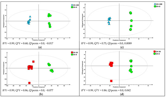 Score plots of pairwise orthogonal partial least squares-discriminant analysis (OPLS-DA) of milk samples data in liquid chromatography-mass spectrometry positive ((a) CH0 vs. CH100 and (b) CH50 vs. CH0), and negative ((c) CH0 vs. CH100 and (d) CH50 vs. CH0) ionization modes. CH0 = green circles; CH50 = red boxes; CH100 = light blue triangles.