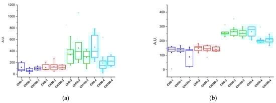 Box plots of (a) thyroxine (T4) and (b) tetraiodothyroacetate (T4A) levels in milk samples for the CH0, CH50, and CH100 groups in the last four weeks of treatments (week 1 = blue, 2 = red, 3 = green, 4 = cyan).