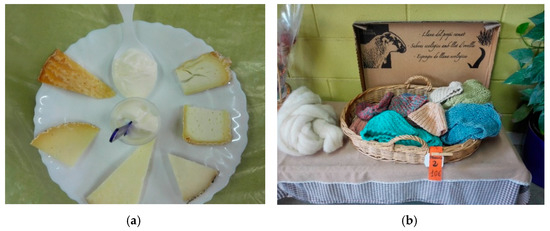 Dairy products can either be eaten on the spot or they can be carried in a suitcase as a souvenir to remember the taste of Empordà later or to let other people try it through its milk and milk derivatives. Food tourism “is the act of traveling for a taste of place in order to get a sense of place” [68]. In this context, in relation to the process of making dairy products (Figure 1a,b), there are a number of opportunities to organize tastings (Figure 2a) and market non-food souvenirs such as handmade soaps, or bracelets made of sheep’s wool, which was observed for example in the shop of Mas Marcè (Figure 2b). This is part of the creative processes that diversify the range of products offered beyond food, and fits with the notion of creative tourism [69,70,71] that nowadays also defines the food tourism experience [72,73,74].