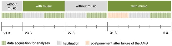 The experiment took place over a total period of 16 days. The experimental design consisted of periods without music and periods with music being played inside the AMS. The succession of a period without and with music was repeated once (Figure 1). Except for the first period without music, the first two days of each period served to habituate the cows; data of these days were not included into later statistical analyses. At the beginning of the second period with music, a technical failure of the AMS led to a stop of about 2 h, resulting in delays in the milking process. To avoid any bias due to this, the data acquisition in this period was postponed by two days.
