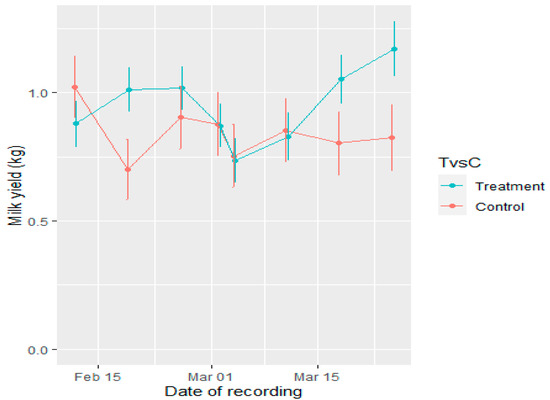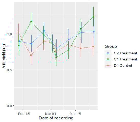 The number of observations of milk production data across the study period, for each treatment group as displayed (Table 1), indicates that counts were constant apart from the C2 treatment group from 11 March onwards, due to the necessity of reducing the milk produced due to temporarily diminished local demand for cheese. There was a significant group × day interaction (p = 0.023), indicating that the time courses of milk production across the three groups were significantly different (note that because of the significant interaction, the main effects of group and day cannot be meaningfully tested). Model-based means are displayed (Figure 1).