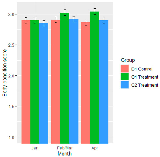 The number of observations of BCS data across the study period, for each treatment group as displayed (Table 2), indicates that counts were constant apart from the C2 in February–March and April. There was a significant group × month interaction (p = 0.015), indicating different time trends for BCS across the three treatment groups. Like milk production, BCS for the control groups remained constant. BCS for C1 treatment and C2 treatment increased over the study, but only C2 treatment was significantly greater that D1 control in April (Figure 3, Table 5).