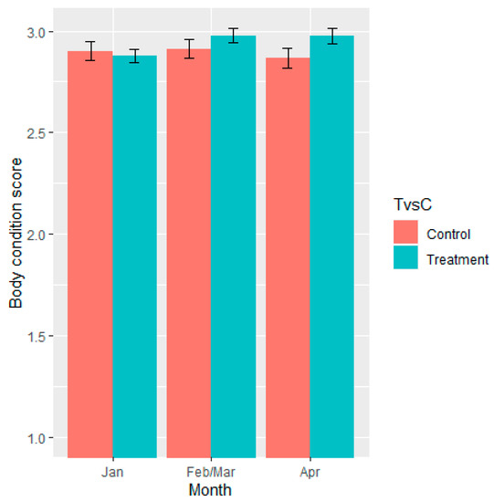 When the two treatment groups were collapsed into a single group, there was a somewhat more significant group × month interaction (p = 0.009). However, while mean BCS was higher in the combined treatment group compared to the control in February–March and April, it failed to reach statistical significance (all p > 0.05) (Table 6, Figure 4).