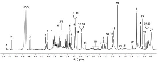 Representative 1H NMR spectrum of a dairy cow serum sample. The signals corresponding to allantoine (1), α-glucose (2), β-glucose (3), BHB (4), lactate (5), myo-inositol (6), TMAO (7), betaine (8), phosphocholine (9), glycerolphosphocholine (10), choline (11), creatinine (12), creatine (13), TMA (14), citrate (15), acetone (16), O-acetylglycoprotein (17), N-acetylglycoprotein (18), acetate (19), citrulline (20), lysine (21), alanine (22), valine (23), isobutyrate (24), isoleucine (25), leucine (26), and L1 lipoprotein (27) are annotated.