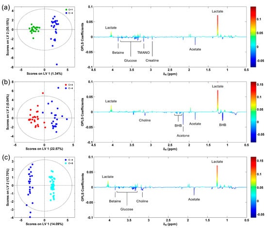 Score and loading factor plots obtained from the OPLS-DA between prepartum (C − 4) and first (C + 1) (a), second (C + 4) (b), and third (C + 8) (c) postpartum groups. The metabolites that differentiate the prepartum from each postpartum group are annotated in the loading factor plots. The R2Y and Q2Y coefficients for each model were 0.80 and 0.72, 0.89, and 0.37, and 0.94 and 0.87, respectively, and their ROC curves had AUC values of 1.00, 0.85, and 0.99 (see Figures S4–S9).