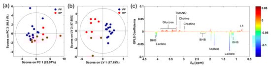 PCA score plot obtained from 1H NMR spectral data for prepartum (C − 4) serum samples colored according to animal parity (a), and score and loading factor plots obtained from the OPLS-DA between primiparous and multiparous dairy cows within this group (b,c). The metabolites that differentiate the two groups are annotated in the loading factor plots. The R2Y and Q2Y coefficients for the model were 0.82 and 0.56, and its ROC curve had an AUC value of 0.93 (see Figures S16 and S17).