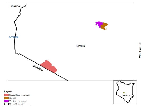 - Reid, R.S.; Rainy, M.; Ogutu, J.; Kruska, R.L.; Kimani, K.; Nyabenge, M.; McCartney, M.; Kshatriya, M.; Worden, J.; Ng’ang’a, L.; et al. People, Wildlife and Livestock in the Mara Ecosystem: The Mara Count 2002; International Livestock Research Institute: Nairobi, Kenya, 2003. [Google Scholar]