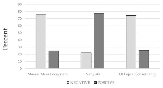 The study findings reveal CCHFV exposure in cattle residing in the two major ecosystems including the Ol Pejeta Conservancy and Maasai Mara. The proportion was significantly greater compared to a study conducted in cattle in neighboring Uganda [] and Zambia []. Interestingly, cattle in the Ol Pejeta Conservancy had a lower seroprevalence compared to those in Maasai Mara, and this may be attributed to livestock husbandry practices (see Table 1). For instance, cattle in the Ol Pejeta Conservancy are kept in an enclosed ecosystem entailing a ranch that practices intense spraying of animals at least twice a week with acaricides as a mode of tick control [,]. The cattle do not interact with other cattle outside their defined enclosure, hence limiting the chances of acquiring pathogens from other ecosystems, unlike the free-ranging cattle from the Maasai Mara ecosystem []. The tick-control strategies in Maasai Mara are variable and on a yearly basis, if they exist [,]. The Maasai Mara cattle migrate from one region to another in search of water and pasture, hence the risk of cross-species transfer of pathogens. Cattle interact with other animals, including domestic animals such as goats, sheep, and wildlife, and, in the process, they may acquire or transmit CCHFV to other animal species []. Cattle also migrate as far as neighboring Tanzania via the Serengeti National Park where they mix with other herds []. Most of the cattle are heavily infested by diverse tick species, including the Hyalomma species that are known to be the main vectors of CCHFV. We believe that the high seroprevalence observed in cattle with the Maasai Mara ecosystem may provide evidence of the endemic presence of the virus and increase the risk to human health, especially to at-risk groups such as herders who interact closely with the livestock. Thus, the different strategies for managing tick populations effectively and the close contact with other livestock species in Maasai Mara might have contributed to the variability observed in this ecosystem.