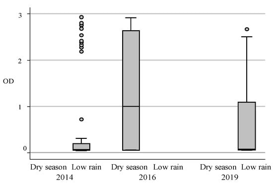 Individual optical density (OD) value by ELISA in different seasons during the sampling years of the surveyed cattle relative to manufacturer’s instructions []. Bars represent the 95% confidence interval of the measure.