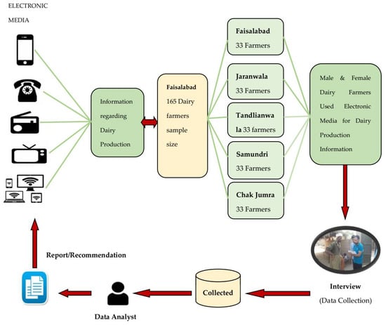 In this age of “global information”, progress and development reflect the importance of ICTs as vital instruments. It can be observed that the majority of people living in urban and rural areas have mobile phones, meaning that they can directly communicate with dairy experts, as well as other ICTs [13]. Mobile phones are the most prominent among all electronic tools because they are the fastest emerging technology among electronic media (EM) and seem to be effective for disseminating livestock-related information, such as precautionary measurements, market issues, and measures to protect against diseases [14].