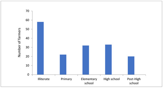 A total of 58 (35.2%) farmers were illiterate. Meanwhile, 32 and 33 (19.4% and 20%) farmers received elementary and high school education, respectively, and 22 and 20 respondents (13.3% and 12.1%) received primary and post-high school education, respectively (Figure 2).