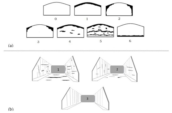 Figure 1. (a) Silage visual spoilage code used to identify the distribution of the spoiling point on the silo face (adapted from Mickan et al. [21]); (b) visual code to identify the bunker maintenance level.