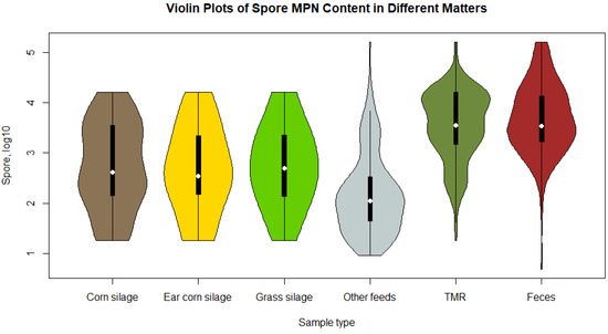 The MPN data of ANSB counts were log10-transformed (MPNld) for statistical analysis. For MPN results, spore counts below the detection limit (i.e., 36 spores/g in silage, TMR, and feces, or 360 spores/L in milk) were assigned a value corresponding to half of the detection limit to calculate the average value. For MPN results above the maximum value allowed by the dilutions inoculated, the maximum values were used.
