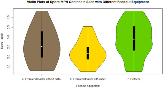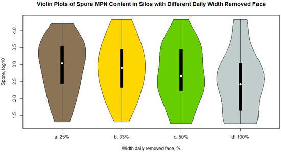 Figure 5 shows the effect (p = 0.018) of unloading system on the silo face spore count. The “front-end loader with cutter” was associated with the best (lower) spore content in the sampled face of the silo that differs (p = 0.025) from the values obtained with a “defacer”.