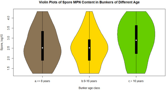 A shift in the distribution toward higher values for the older silos was appreciable. The age class of bunker silos did not affect the spore content in our study, even if i the different distribution shapes in Figure 6 seem interesting, where a trend toward higher spore values is appreciable for silos aged more than 16 years.