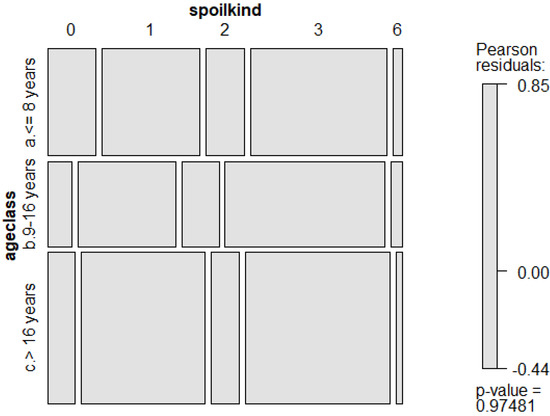 There was a trend (p = 0.057) toward an effect on the kind of spoilage. Based on pairwise comparisons, the spoilage “2” (lateral, Figure 1a) reported higher (p = 0.040) spore values than “1” spoilage (upper surface only). The lack of greater significance is related to the unbalanced frequencies between the different kinds of spoilage, with spoilage “2” less represented than “1” and “3” (see the mosaic representation in Figure 7).