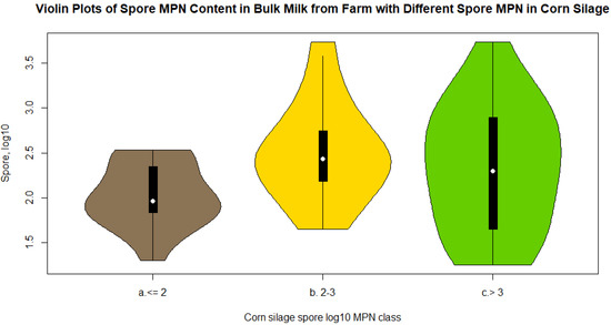 No models including fecal ANSB count showed significant results to explain milk ANSB content. Stratifying farms by the level of corn silage spore content in three classes, the ANOVA model evidenced a significant effect of corn silage contamination on farm milk ANSB (model p = 0.024), with the lowest MPNld value in the lowest class of corn silage ANSB contamination (2.03 ± 0.13, 2.50 ± 0.11, 2.34 ± 0.12 as LSMEANS and SE for the three classes, respectively, in growing order of ANSB in corn silage). The violin plot in Figure 8 shows the different distributions of MPNld between the three corn silage classes.