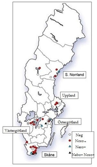 Geographic location of dairy herds positive or negative for bovine norovirus (Noro) and nebovirus (Nebo).