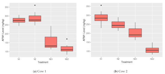Figure 1 shows the pattern in AFM1 concentration in milk from the four experimental units during each period by the treatment applied.